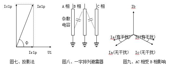 現(xiàn)場測量時(shí),一字排列的避雷器(圖八),中間B相通過雜散電容對A、C泄漏電流產(chǎn)生影響,使A相φ減小,阻性電流增大,C相φ增大,阻性電流減小甚至為負(fù),這種現(xiàn)象稱相間干擾(圖九)。